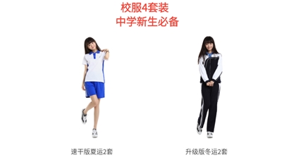 | 中学新生(女生款)速干版4套含有: 中夏女运套装速干版2套 中冬女运套装升级版2套 | |||